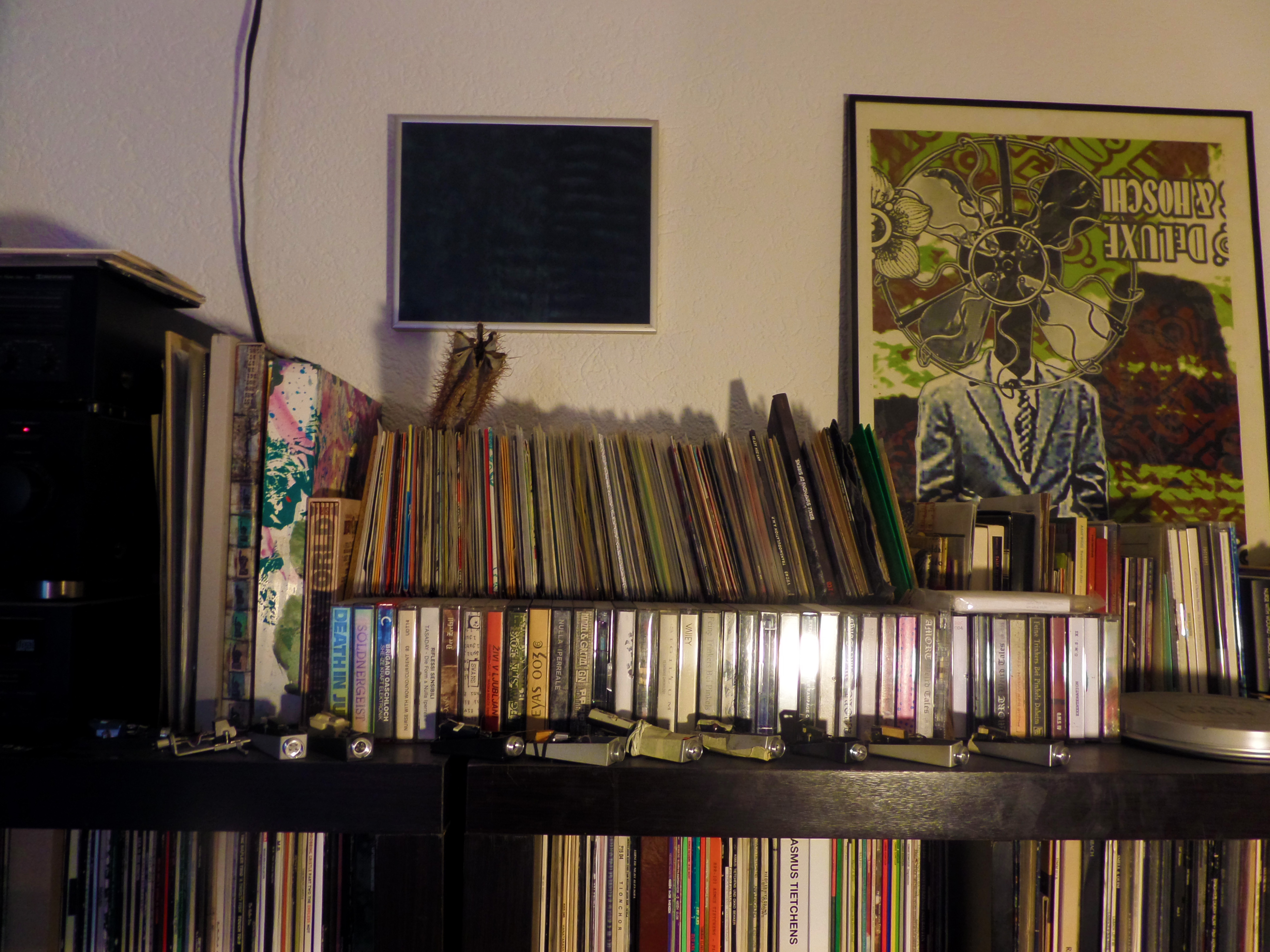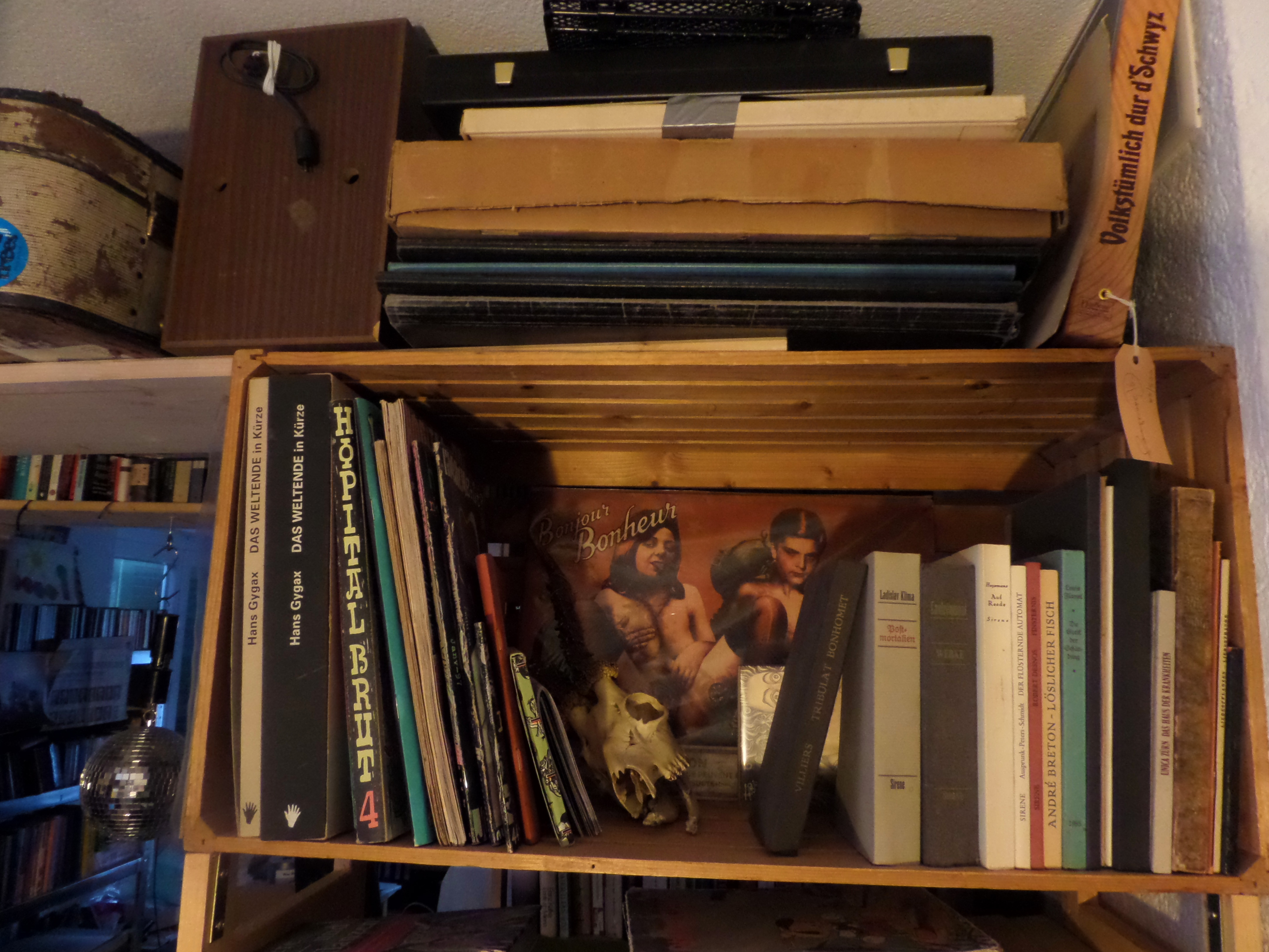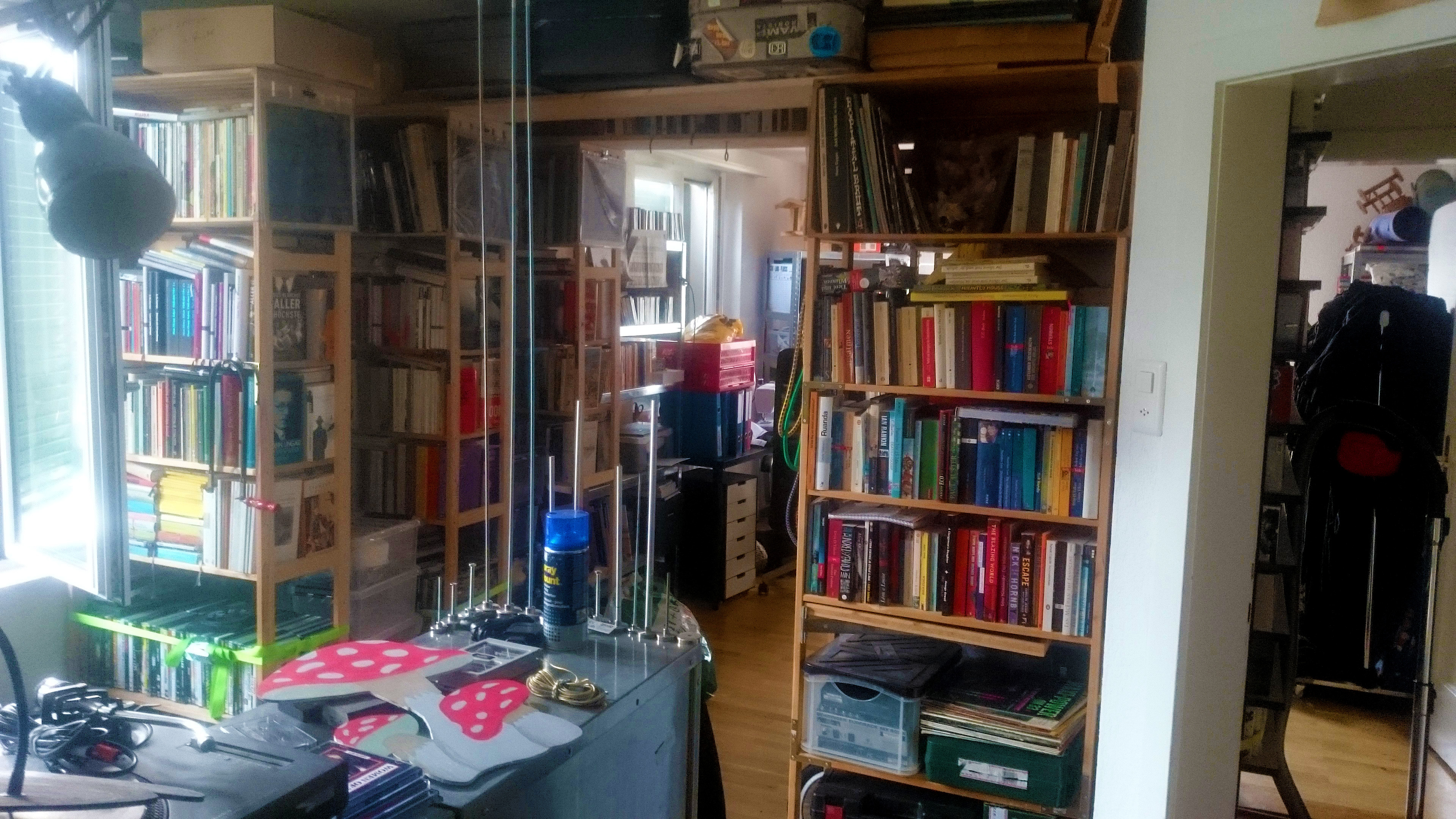Well it is just my personal room at our rented apartment where I live with my family. It is my rehearsal space, my laboratory, my workshop, my office, my store, etc. So in that room are my collections of records (the CD’s are in the hallway), my books and all the devices I might use for my music and installations. So it ist actually just a table with lots of filled up shelves around – all my friends hate it when I have to move…