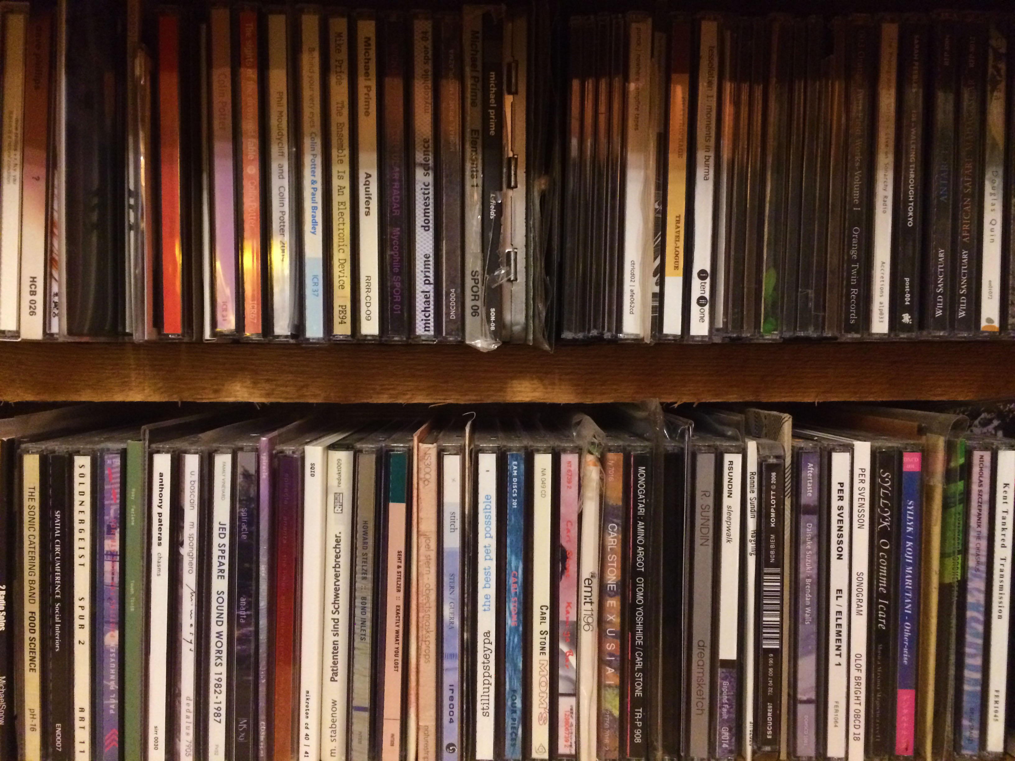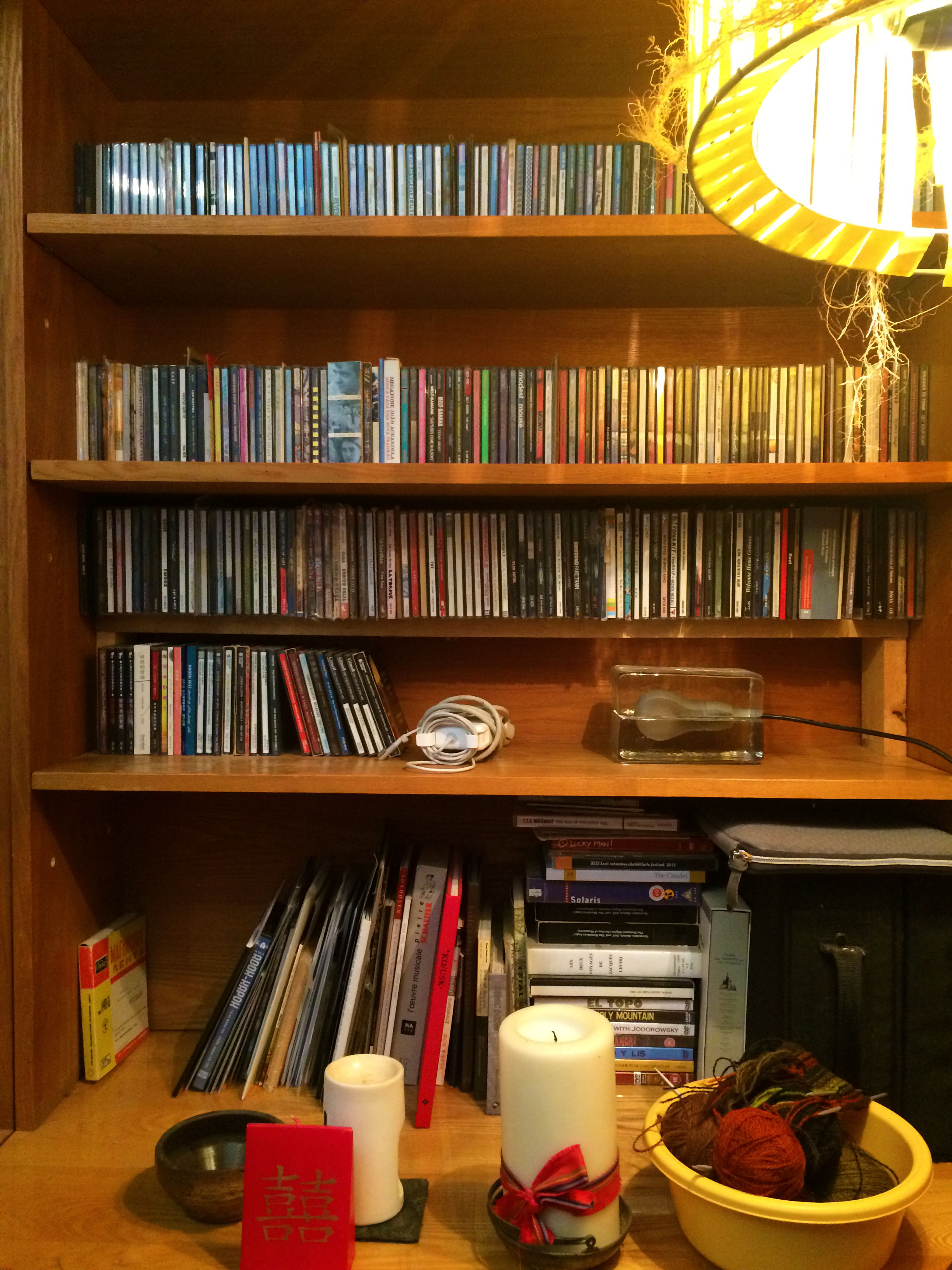 Actually, there are a lot less objects on the shelves than there would have been if I’d taken these photos a week earlier. The shelves, in front of the CDs, used to be full of stuff, stones mostly, and other pleasing small objects. It made the CDs a little difficult to get at, but to be perfectly honest, most of them haven’t been played in years. We listen to a lot of radio at home – Resonance FM, KFJC, WZBC, and BBC news – and the music collection is a bit neglected. I listen to so much for the radio show, I often can’t be bothered to choose something to listen to in the living room. Also, since most people have stopped sending physical media to radio shows (and I don’t buy much), the collection is something of a snapshot in time. It grew to those proportions between 2000 and around 2010, since then if hasn’t changed much.