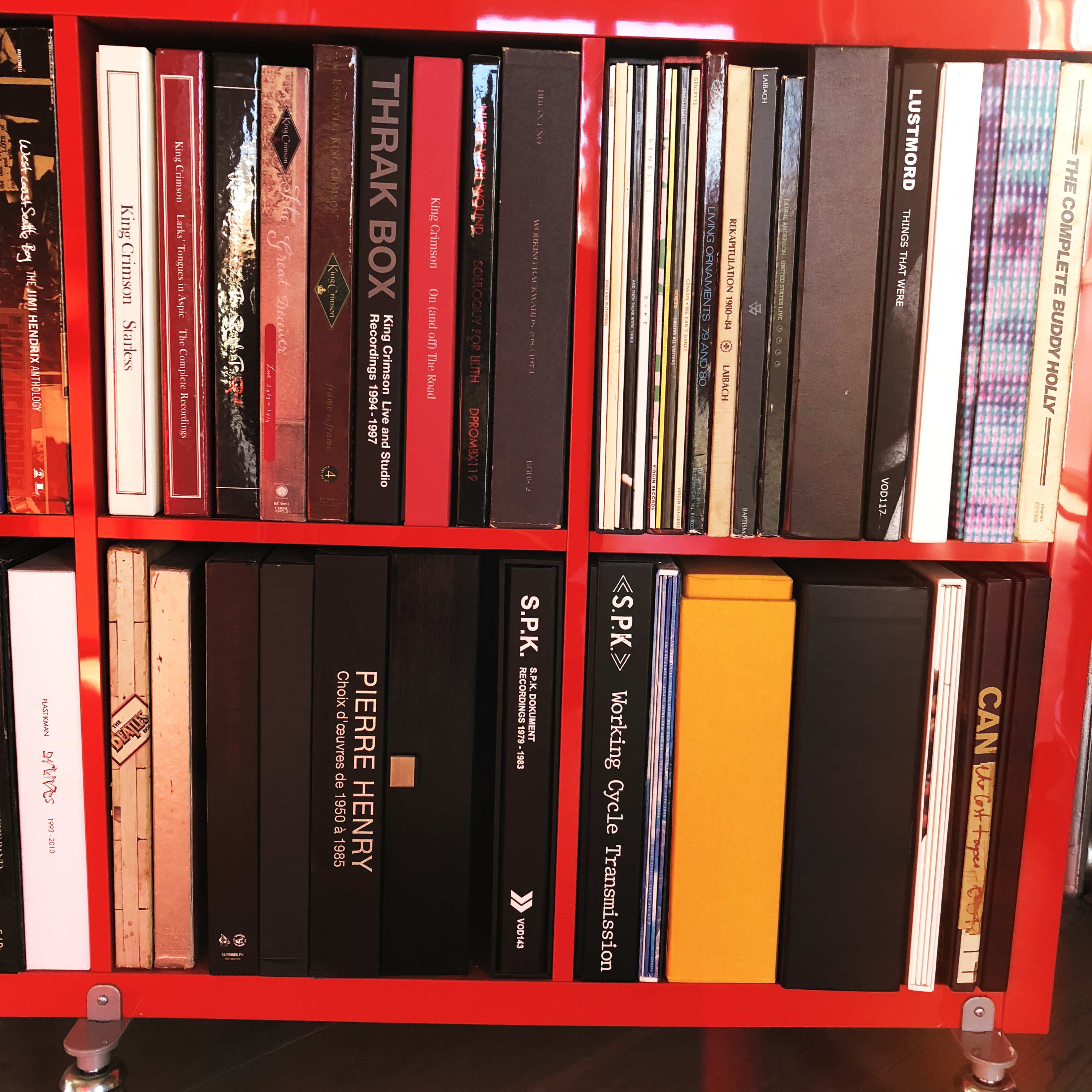 Amusingly they are far from exotic and unusual, having been bought at popular Swedish furniture shop IKEA! I live in a former textile factory in the UK and the grey curtain covers one of the entrances, so the entire case can be wheeled out if necessary for a special delivery or access! It’s clever really 😀 As to the box sets of artists – I’ve been been an obsessive listener and collector and want to hear everything from an artist, so once I’m interested I need to hear and acquire everything! The sets reflect the music I’ve grown up with and continue to listen to today. The Vinyl on Demand label produced some extraordinary boxsets of rare industrial and experimental music from a host of artists and I treated myself over the years!