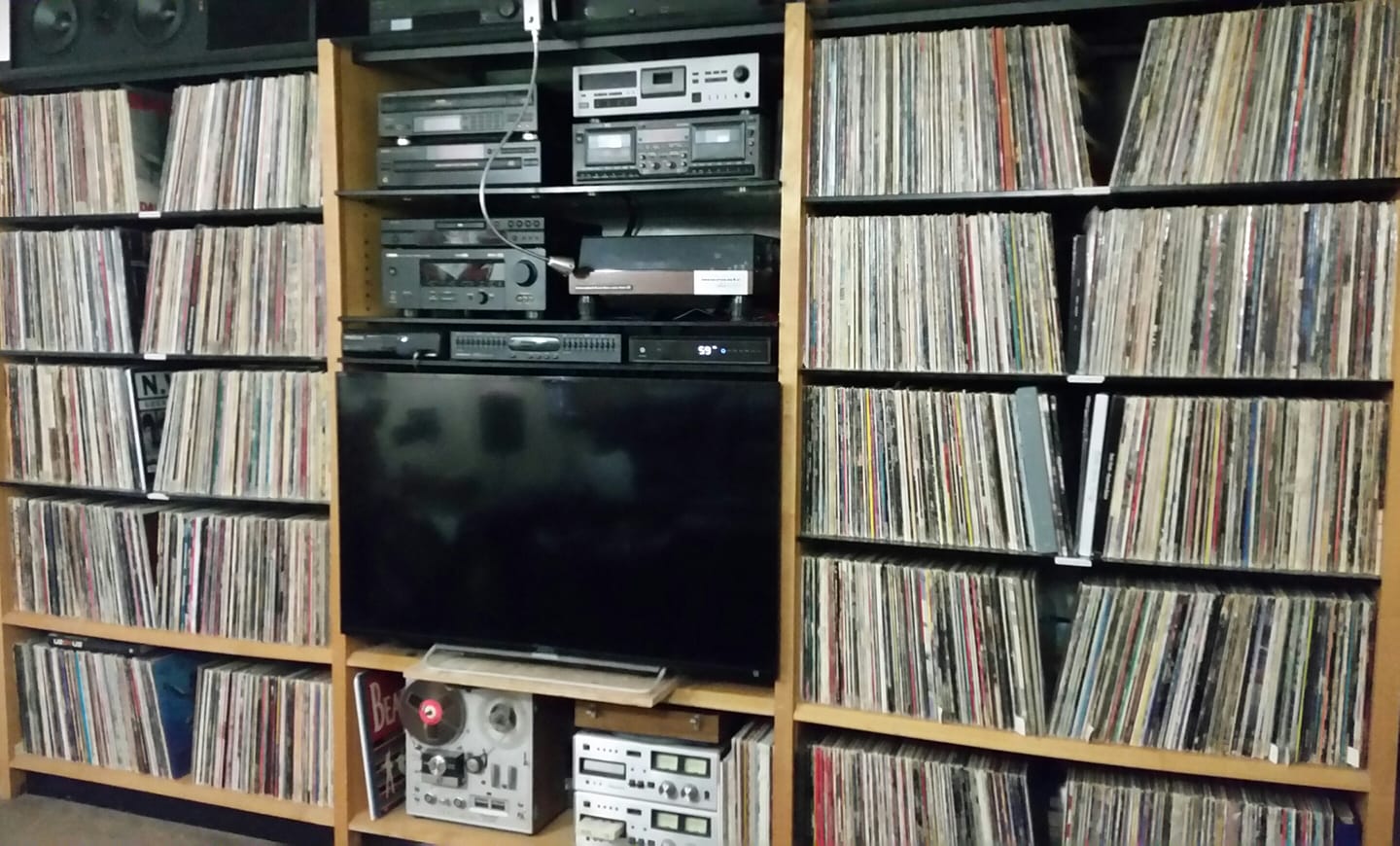 If you multiply that times ten (10 songs on average per album), I am sitting with over 250,000 songs. Plus Thousands of music-related Laserdiscs, DVDs, CEDs, sheet music, music memorabilia, wall art, 2000+ 7 inch 45s, ect. My equipment ranges from modern stereos and amps, to vintage Hi-Fi. My picture shows my Marantz 6300 turntable, Tascam 302 cassette player, and a Sony DAT tape machine, my reel to reel player is a Akai, I have better reel to reel players than that, but that’s the only one small enough to fit in my entertainment centre. The two Panasonic rs808 8-track players I picked up on a road trip with my wife. They are cool even though they’re mediocre quality, because their serial numbers are one digit off, which means they have been married their whole life, one ends in …26 and the other ends in …27. I enjoy talking about my life long love… music.