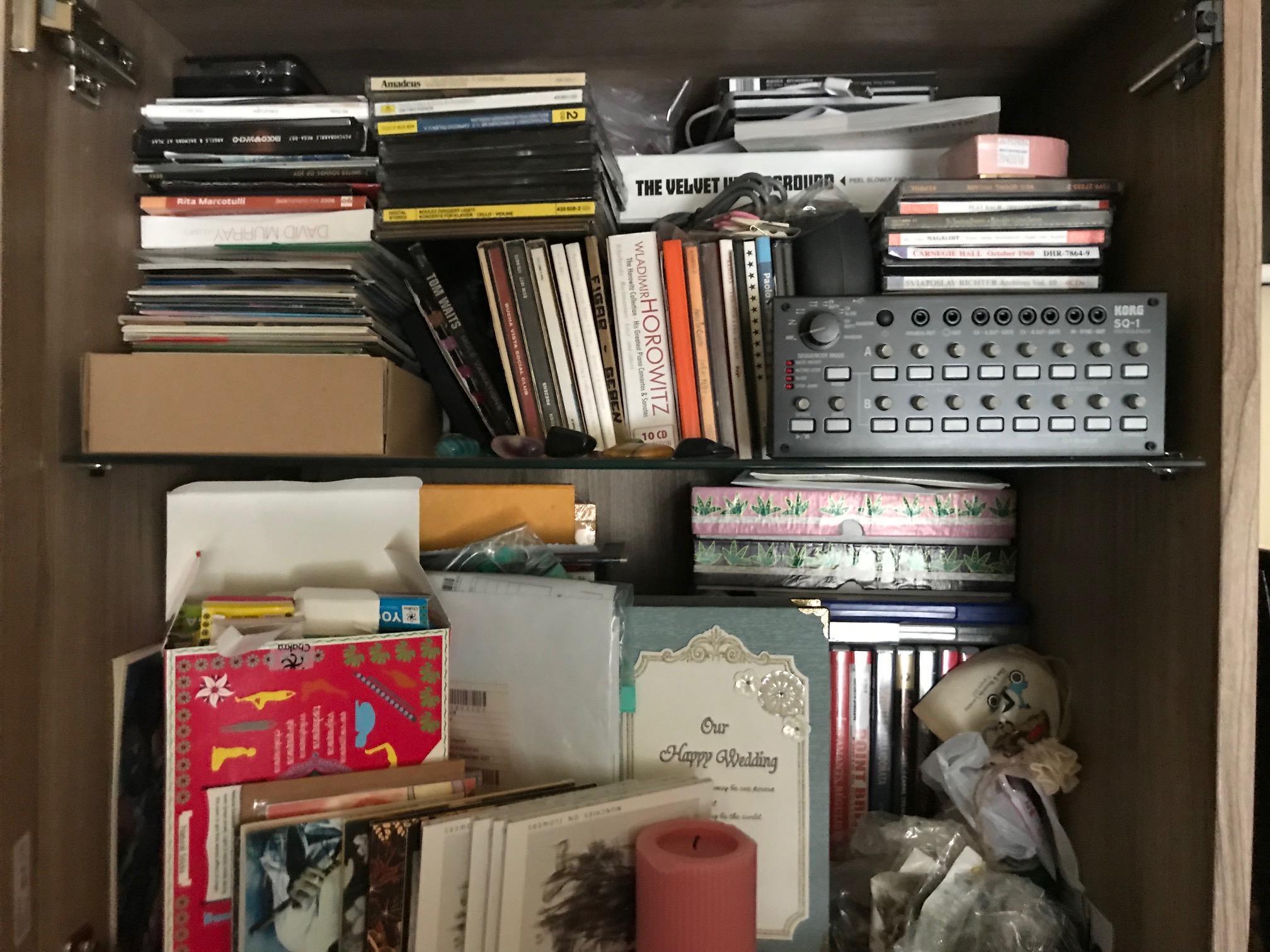 That’s so funny: I first noticed the pile of instable books, so I though “well, for sure Riccardo doesn’t has kids around”. Then I saw the one with the little baby attempting to the safety of your turntable. This is a topic often covered by Concrete Shelves, for instance Mark Nelson of Labradford/Pan American sent me pictures of his dog climbing over his beloved and precious amps. He said this helps him to keep his ‘audiophile side’ under control. So I suppose you’re not too much attached to your stuff, right?